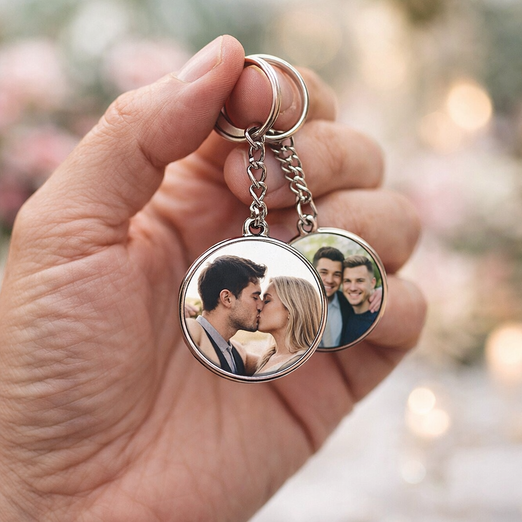 Les porte-clés peuvent être personnalisés sur deux faces selon votre souhait ( deux photos possibles / ou le nom de votre mariage).